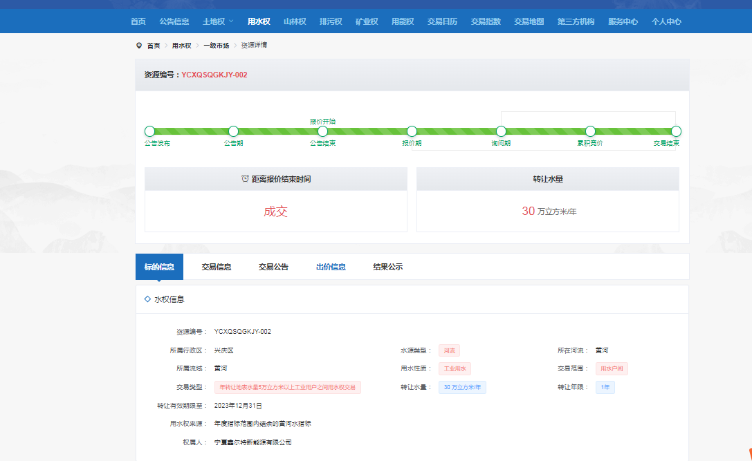 近日,寧夏鑫爾特公司與天通銀廈新材料有限公司、寧夏中欣晶圓半導體科技有限公司成功交易工業用水權30萬立方米,出讓收益27.27萬元。此次交易的用水權為寧夏鑫爾特公司節省的工業用水。