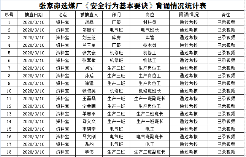 根據(jù)陜煤集團(tuán)陜北礦業(yè)公司要求,為了強(qiáng)化張家峁選煤廠廣大職工復(fù)工復(fù)產(chǎn)后對于安全生產(chǎn)的深刻認(rèn)識和理解,提高廣大職工的安全生產(chǎn)意識和自我保護(hù)能力,張家峁選煤廠于2020年3月10日下午16:00舉行《安全行為基本要訣》現(xiàn)場考核背誦活動。